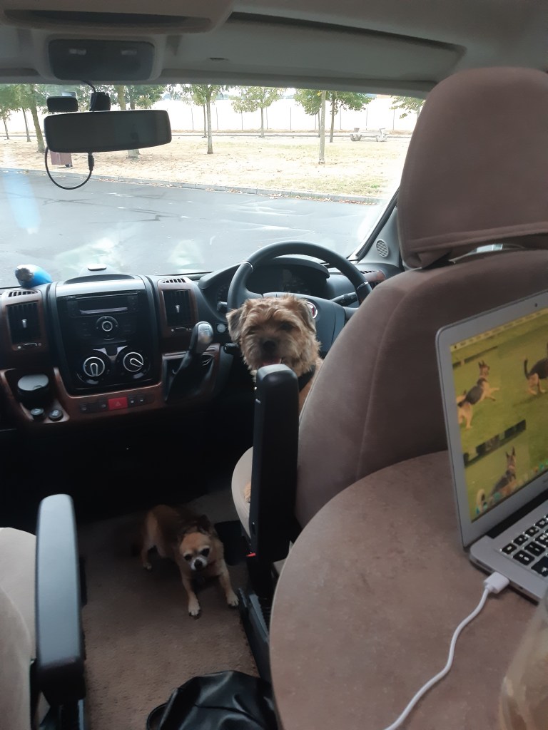 Now I bought this massive Mothership so the dogs could be transported in comfort to their new home. A four berth, loads of seat and floor space so they could spread out whilst we ate up the miles. I might as well have bought a Mini as they all decided to get as close as possible to being in the footwells including Arry. The only one to partake of her luxurious surroundings was Simi who loved the wide window seats even when the seat slipped off during precarious roundabout driving. Irene’s co-driving seemed to entail shoving the seat back every time we got back on a straight road. Simi wasn’t perturbed. And after a relatively quiet night in a lorry park just outside Chartres, we hit the final stretch of the expedition in good spirits. It was also at this stage that we discovered on making morning coffee that we had lied to the transport police at Folkestone, the gas canister was on. Anyhow, caffeine’d up, we hit the road home easily covering the hundreds of miles towards Carcassonne. By this stage I was beginning to feel ‘at one’ with the Mothership and rather enjoying the power of a monster vehicle (you can see into lorry cabs you know) so it was a little annoying that I missed the familiar turning off the autoroute to Carcassonne East. Actually more than a little annoyed because I really didn’t want to drive into the centre of town in a big white bus. Temper flaring and several missed turns later, I got back en route thanks to the ever patient Irene and Google and headed off towards home. At the final toll booth, my foot slipped on the brake and the Mothership careered straight into the gate. Luckily the toll tag on the car beeped just as we hit it and the bent gate rose unsteadily to let us through. I wasn’t stopping to check for damage and floored it for the remainder of the short trip to L’Horte.