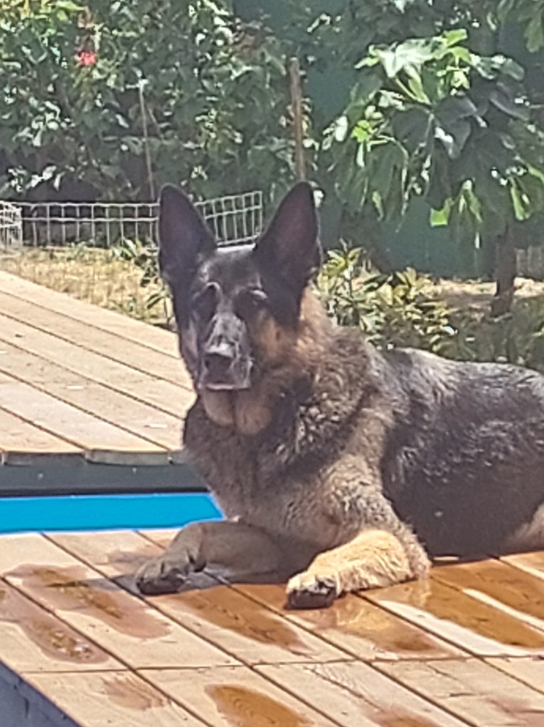 Yesterday, and despite the heat, the lovely Lionel and darling Denis got the fencing up. The gates still have to be made so we have had to make temporary ones but for the most part, the garden is just about ready for the next load of summer visitors. The woofers are somewhat bemused about the sudden loss of gate-barking opportunities (although Sherman didn’t take long to find a gap to squeeze through) but I’m sure our neighbours will appreciate it. Mind you, they aren’t whizzing around as much as stretched out under various trees or in Alice’s case, under a poolside umbrella. I had a minor panic the other day when I found Gizmo lying flat out on my floor tiles with his legs stretched out in every direction, I thought he’d fallen off the sofa and couldn’t move. Poor little old man wasn’t happy when I started checking for injuries when all he wanted to do was keep cool. We are due for some rain and lower temperatures next week which should please both woofers and garden, I shall relish not having to drag the hose out every evening to dose the young trees and bushes. The reel and I have an ongoing battle, I drag its 50 metre length out, water everything and then spend several minutes swearing at the damn thing trying to wind it back in without half the hose coming off the reel. That and having to try and restrain Arry and Sherman from ‘eating’ the spray. Still, roll on summer and let the good times begin…Arry style….