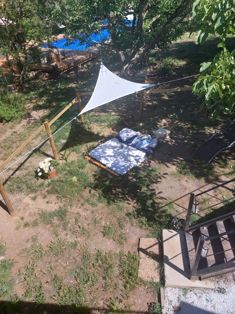 The summer scorch has arrived. The grass has all but disintegrated, leaving nothing but bare earth and spiky stalks over the garden and the woofers reduced to flopping under the trees or in Sherman’s case, under the pool deck. Clever dog. My days can be spent gorging on plums and strawberries whilst I potter sluggishly around the grounds, the evenings are still a battle between me and the damn hose reel. There is little point in trying to plant anything as the ground is like cement at the moment although Denis did manage to stuff a very large cactus near the pool house. I put together a sort of Turkish bed affair in my little apartment jardin, complete with sail shade so that I might have somewhere cool to doze in but naturally it’s already covered in paw prints. I think I put it there more for aesthetics than actual use as I can’t sit still for long enough to reap the benefits. Thank the Gods for the pool, even if the water temperature is only a few degrees lower than the space above it. Arry and I can burn off our excess energy since running up hills is out of the question. The only downside to having such a luxury is having to clean the skimmer nets loaded with dead insects every morning – not a ritual I look forward to.