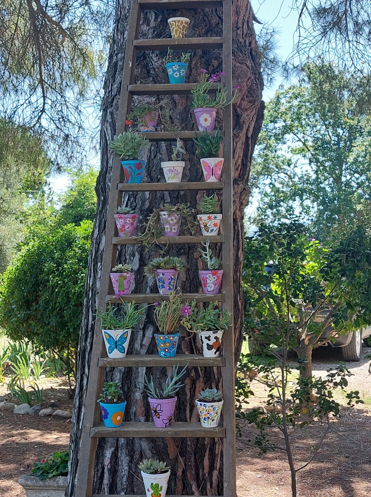 I’m not going to think about the fact that Rene will be returning to the homeland on Tuesday or the fact that Denis and I still have a lot of work to do in the garden before the family arrive – yup gates still not fitted yet. And even though I haven’t lifted a finger to do anything constructive all week, Marina has and she finished decorating my little terracotta pots for an ancient ladder her dad found. Now each housing a little succulent, they are perched proudly right in view of anyone passing by the front gate with their vibrant colours and motifs. And well out of reach of Sherman……