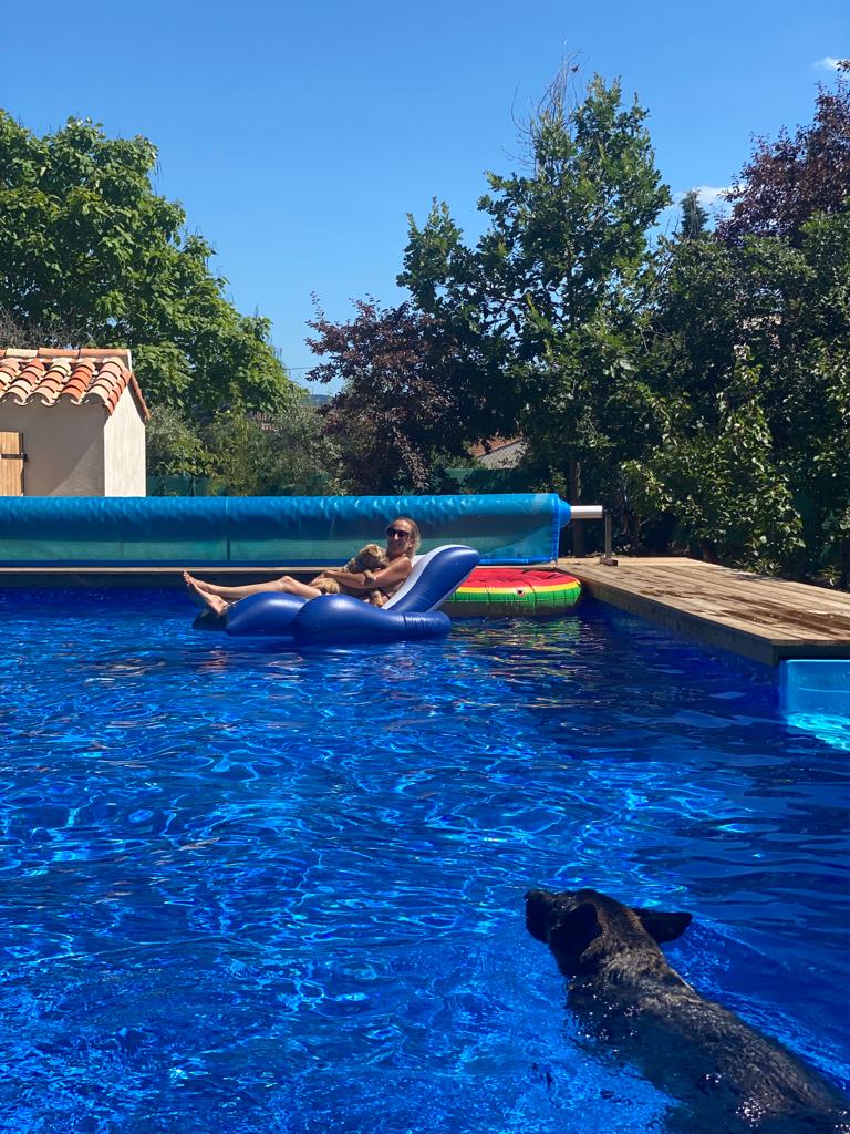 First few chapters sent off to Sally my editor and the barrier for the pool stairs lathered with protective oils, I cleared my workload so I could spend this week with my bestie, Rene. Aside from the odd trip into town, we have done nothing but snooze by the pool all day and chat over glasses of wine on the balcony all evening. For someone who finds it impossible to keep still for 5 minutes, the ‘R and R’ has been a welcome relief for my poor muscles – the only exercise they are getting is a bit of swimming. The woofers are relishing her company, decamping from my bedroom into hers and ignoring me for someone who doesn’t mind their yapping and generally bad behaviour. Alice has also discovered the joys of sitting on your lap whilst you loll about on an inflatable chair, looking like a grande dame on a cruise around the Med. Poor Rene has had to put up with Arry’s shark impersonations whilst she tries to get a few lengths in but all in all, we are loving having our girl here.