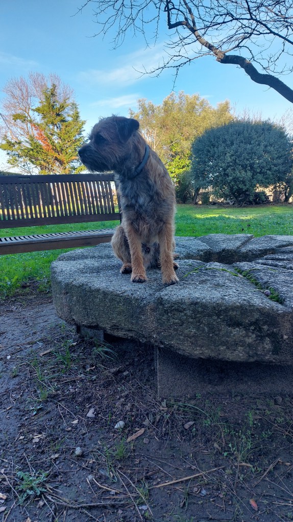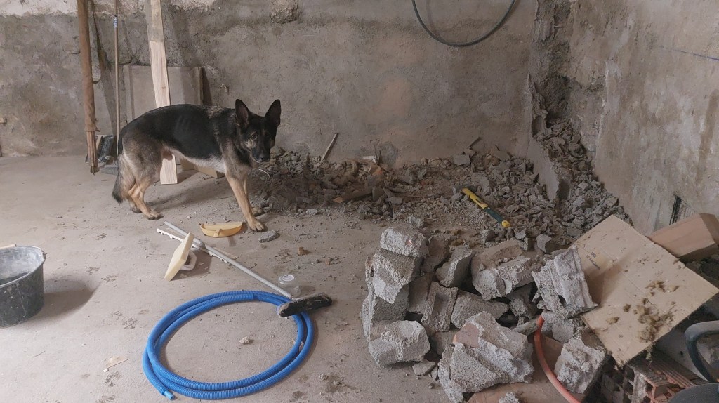The following morning I went out and checked the boundary line. I found the first hole right where Arry had pointed it out, a minute gap but Sherman is a terrier after all. And then I found another and another – the mischievous mite had carved out more tunnels than The Great Escape. He made another bid for freedom the next day but this time I knew exactly where he’d gone and once retrieved from the field opposite, I shut him in the apartment garden whilst I shored up the defences with logs, heavy ones. Until Denis is back and fit for work, I’m hoping and praying that my temporary measures will curtail another attempt on my sanity. I can’t really blame Sherman, it’s in his genetics – his mum Alice chased a cat through the old drain between the back garden and the courtyard this morning, something I thought she wouldn’t do again since she nearly got stuck the last time but she’s been on a diet. And speaking of diets, Coco Loco needs to go on one as, owing to his belly just about touching the floor, his wraps keep sliding off. I spend half my day following him with a mop.