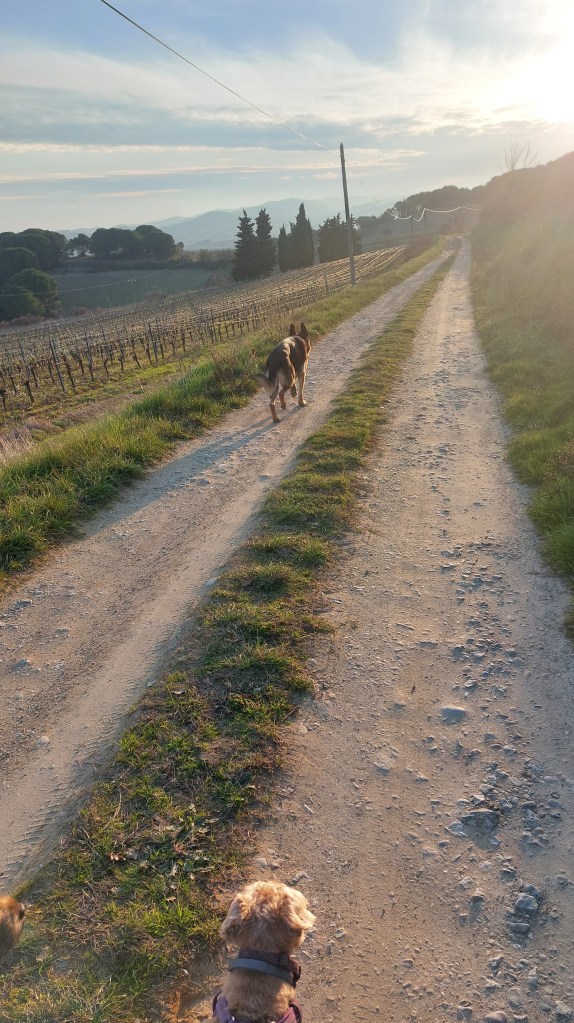 With the winter months all but over, the chasse or hunting season has finally ended which means a change in scenery on our dawn runs. Whizzing through the vines has become a bit of an extreme sport, what with keeping the woofers out of the way of tractors turning the dried out clay soil into lethal ankle-breaking gulleys – I still have my knee strapped up like a Victorian corset so I could do without adding another trip up. Whilst not unfamiliar, this route is more road than rough clay and pretty much all uphill until you get to the last bit – what goes up must come down at some point, better on the knees but harder on the butt. And my peace of mind because the down bit means entering the neighbouring village, Prexain and its cats. Arry especially likes the latter which means me having to put his lead on and hope to hell he doesn’t spy a feline or two. Arry + downhill + prey is not a pleasant experience.