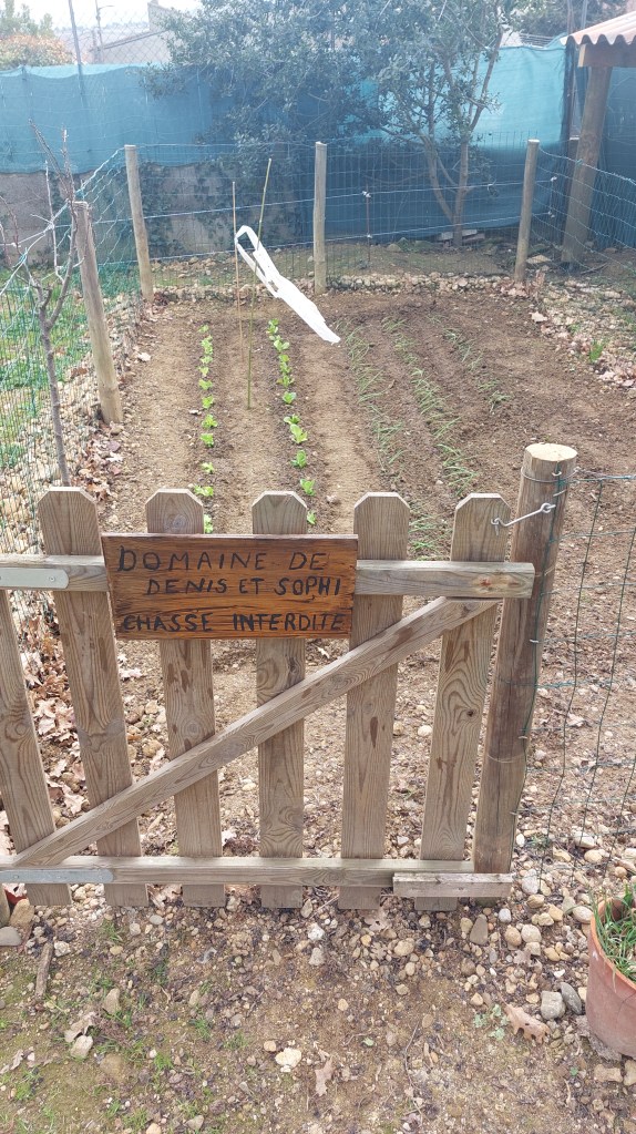 Swedish home furnishings weren’t my only purchases last week, Denis and I finally got around to salad shopping. Our potager now has almost perfectly straight rows of lettuces and spring onions, all waiting to grow up and be summer suppers. Denis strung some bits of white plastic sheeting on bamboo poles to keep the birds at bay – I did suggest putting Papa Noël in the enclosure but apparently, the oiseaux are wise to portly men with white beards who don’t move a muscle. Speaking of winged creatures, I fear we may have had a death or two chez nous. I think either Mrs Pratt the pigeon or her bird-brain of a husband are no more, the incredibly messy construction of their nest above my terrace lies empty and I did see Arry carrying around a feathered corpse the other day. I doubt he is capable of catching one but the local buzzards are partial to a pigeon pie so one might have dropped its prey. I will miss seeing their ugly babies poking their heads out from the roof space.