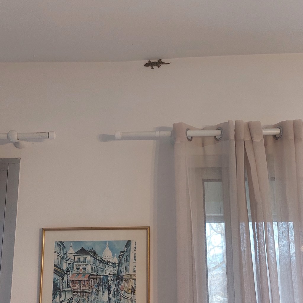 I know I promised my family that I wouldn’t add any more pets to my pack but it appears I have adopted another. Gabriel or Gabrielle, as I have no idea how to sex a gecko nor would I want to, has taken up residence in the living area. My Moorish or Common Wall Gecko doesn’t seem to do much except plaster itself upside down on the ceiling rather than snoozing on a wall but since he/she/it is great at keeping flies and mozzies at bay I’m told, our new house guest is welcome to stay. As long as it doesn’t suddenly do a death drop. Thankfully the woofers haven’t noticed a change in resident numbers, I dread to think what a lizard would do to Arry’s digestive system. I wonder if he’s allergic to them? He’s allergic to practically everything else.