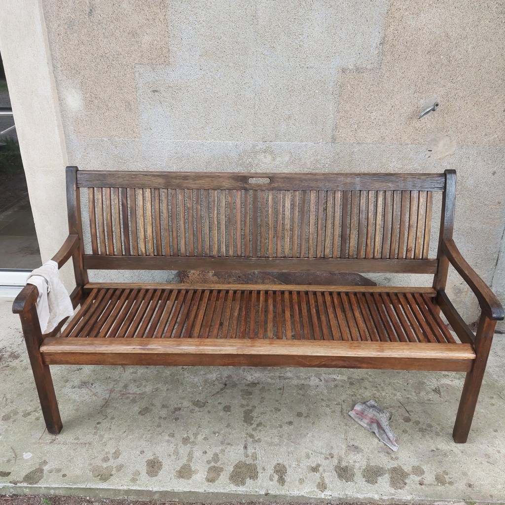We may have gone all ‘eco’ with the impressive solar sheets tilted against my terrace wall but as yet, we haven’t had much sun to make the most of them. It’s been a windy, wet week with the exception of Monday (perhaps Thursday as well but I can’t think when everything is covered in grey cloud) but the garden is happy. The trees are green once more and the wisteria is popping buds all over my apartment frontage. Bunches of wild garlic have added a sprinkling of white to the otherwise mostly pink blossomed Spring display. The lettuce are growing bigger every day, I think my morning motivational chats are encouraging them to reach for the sky and Denis has managed to cut most of the over-grown herbes in between the downpours. As rain has most definitely stopped me playing outside, I have discovered a new passion – restoring furniture. It all started with my theatre chairs, now gracefully sitting in the lounge with just the arm rests to re-cover. There is something about seeing old, dirty bits of wood transformed with a bit of elbow grease, a lot of washing up liquid and various oils. The garden bench is now a gleaming piece of teak technology as is Mumo’s rather funky 1960’s chair. Both survived the floods at L’Horte although, judging by the amount of gunge I removed from all their nooks and crannies, I highly doubt they’ve seen a sponge since. Yesterday, the lovely Lionel popped in with a ‘seen better days’ mirror that he thought I might like. Frankly it’s so ugly, it’s beautiful. Someone painted a ‘trompe l’oeil‘ on the glass, adding olive branches and a village landscape below, strangely eye-catching if you excuse the pun. At the moment the whole piece has decades, if not centuries, of grime embedded in both the frame and the mirror itself but I’m looking forward to finding its inner beauty.
