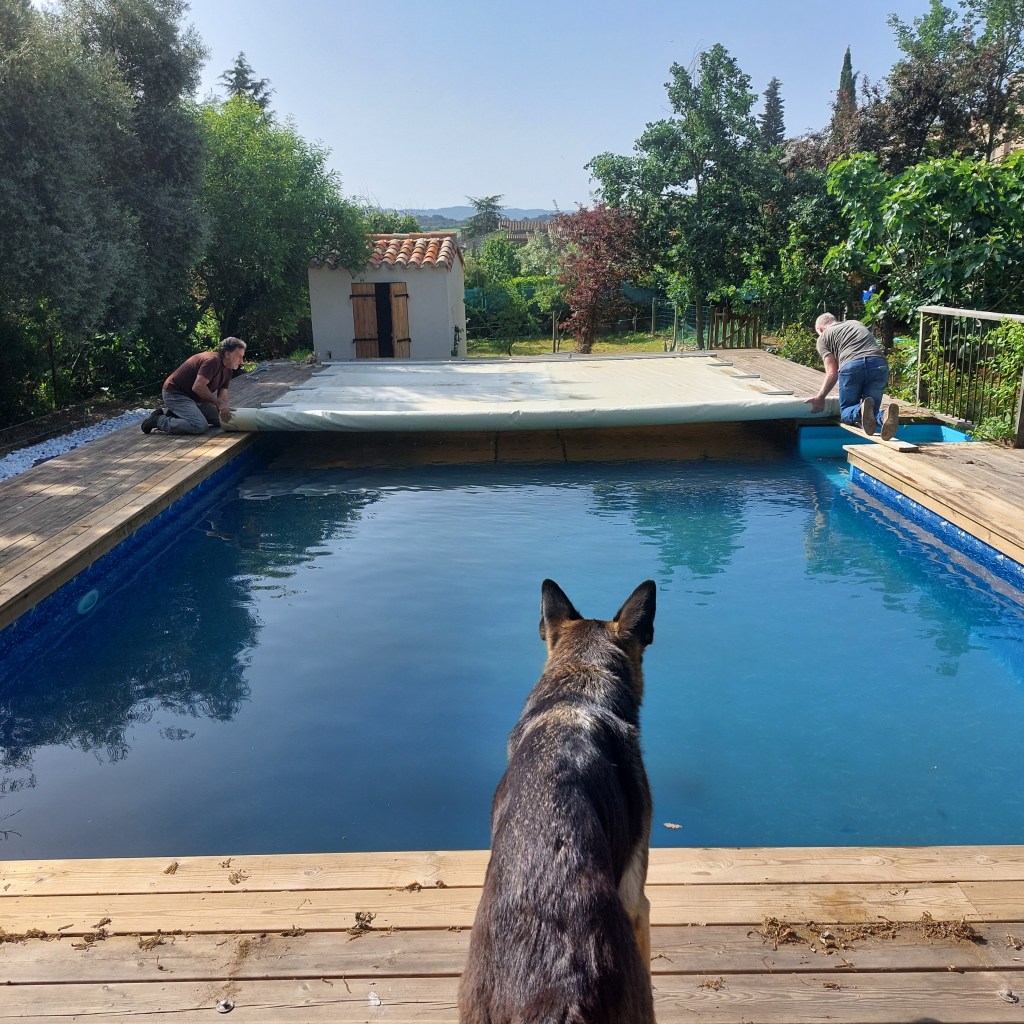 With the thermometer climbing well into the high 20’s and the forecast showing signs of summer, I decided it was time to take the winter cover off the pool. Since Roy had given the water a chlorine ‘shock’ the night before, I coerced Nick (who I always call St Nick due to him never saying no to me) and my darling Denis into rolling the heavy steel-roded bâche into a neat giant sausage shape and heaving it into its storage bay. Naturally I made them bring out the summer version whilst they were down there, I had my hands full videoing and photographing the great occasion so I could do a little more ‘Book’ advertising. Luckily, the water was still clear – I’m told that many in Rouffiac have de-clothed their pools and found them green but we were left with a very dirty bottom. All those winter winds coming up from the Sahara had dumped a whole lot of sand en route to wherever they end up which of course, turned into a sludgy slime. The robot has been in at least three times. It’ll take a couple of days before the piscine looks inviting enough to swim in, unless you’re Arry and then you’ve done a few laps already, but at least with so much heat this weekend, the water is warming up nicely.