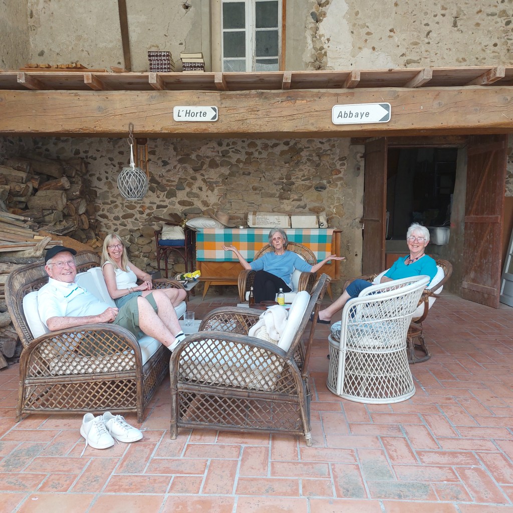 The sun has got his hat on, hip hip hip hooray! Finally after weeks and weeks of constant pluie, the bikinis are out and sunglasses on. The change in the weather couldn’t have come at a better time as we have had guests all week. Sue and Pete have been family friends for over half a century, from back in our Kenya days, along with their two children Debs and Rick although only Debs joined them this time. Naturally spending a week here involves one or two trips to wine-related hotspots – I took them up to Laetitia’s family vineyard which lies just above the village and of course, to the Cave (wine co-operative shop) in St-Hilaire. On the way to the Cave we took a little detour down to L’Horte as they hadn’t been there since before Pop died. Or since half the building have been pulled down and Severine and Nicolas have built the farm on our land. I suppose I’ve got used to seeing the old property change over the years but it was quite a shock for them. Sadly all return to the UK tomorrow evening so we are making the most of their last evening here and Simon’s barbecuing. Again. Thankfully it’s a Bank Holiday tomorrow so everyone can recover.
