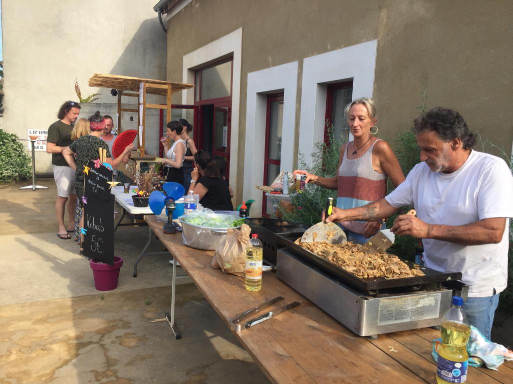 It is just as well that I now have a calm space to collapse into as Friday night saw the start to Le P’tit Bistrot or the weekly village get-together. Denis and I have been charged with handling the nutritional side of things, actually he roped me into helping him (I’d have been more at home behind the bar). It’s a good job the man knows a thing or two about running restaurants and festival food stands because we didn’t stop serving up kebabs for five hours and that was only because we ran out of meat. I have to say, we made a pretty amazing team, him on the grill and me filling the wraps and if the compliments were anything to go by, a very successful one too. In fact, the whole evening was a monster hit with everyone from the very energetic band to the bustling bar – what a great start to the season. Roll on summer and all things sunshine and soupy pools…