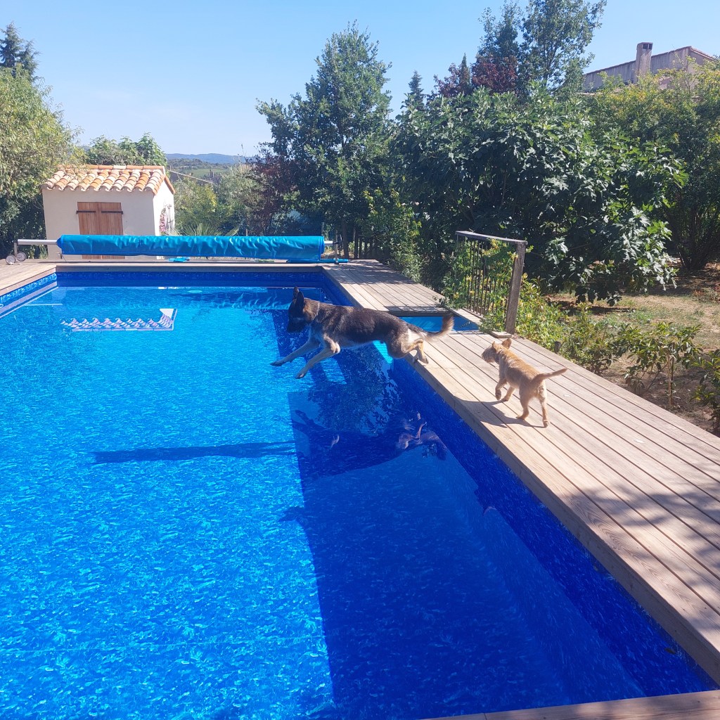 The heat hasn’t helped with my sleep routine either – I’ve got fans on full blast with panting woofers strewn below them. Arry is spending more time in the pool than out of it, the others preferring the afore-mentioned or the cool earth under the pool deck. Mind you, as much as I love cooling off in such heavenly waters myself, as soon as you are out and dressed for the evening ahead, you’re sweating again. If you think that perhaps wearing shorts and T-shirt is appropriate attire for aperos, absolutely not unless you want to be eaten alive by the midges. I am not complaining however, with it being a good 10 degrees warmer here than the former land that is the UK I am going to have to pack a couple of sweaters – my body has become accustomed to 30 plus Augusts.