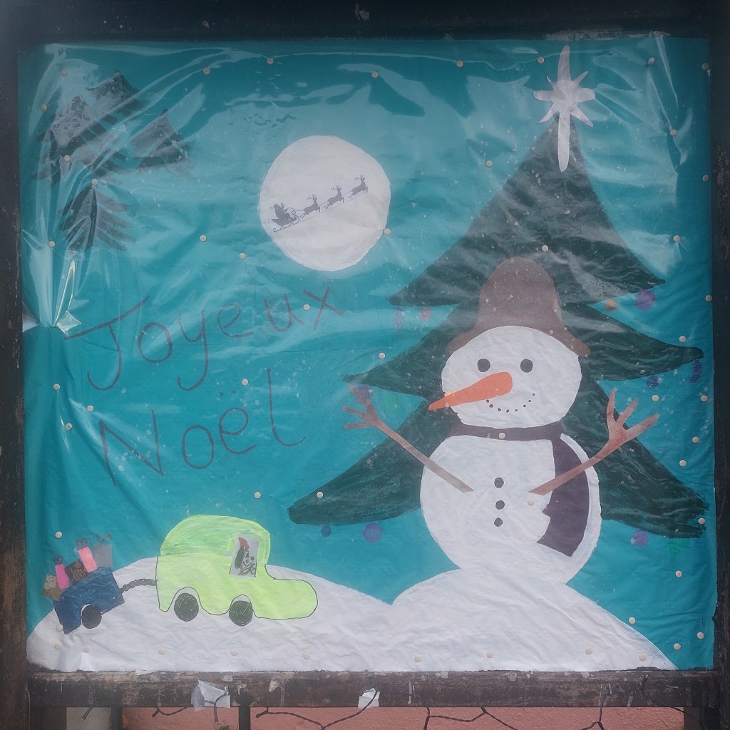 It wasn’t just us humans who got brought down by the nasty wind, it took down my painting too – the one I had done for the information panel next to our corner wall. Luckily the new one that I spent hours slaving over is now wrapped in heavy duty plastic and covered in so many thumb tacks that it’s going to take until the Spring to get it off. Mind you, I’m told my second attempt is a veritable masterpiece especially as I added Denis’ little camionette into the canvas. Mme who lives across from it is still in a mood about not being able to park on our bit of land so does her best to stick her car in front of my artistic work instead. Ah well, I’m being of good will to all at the moment.