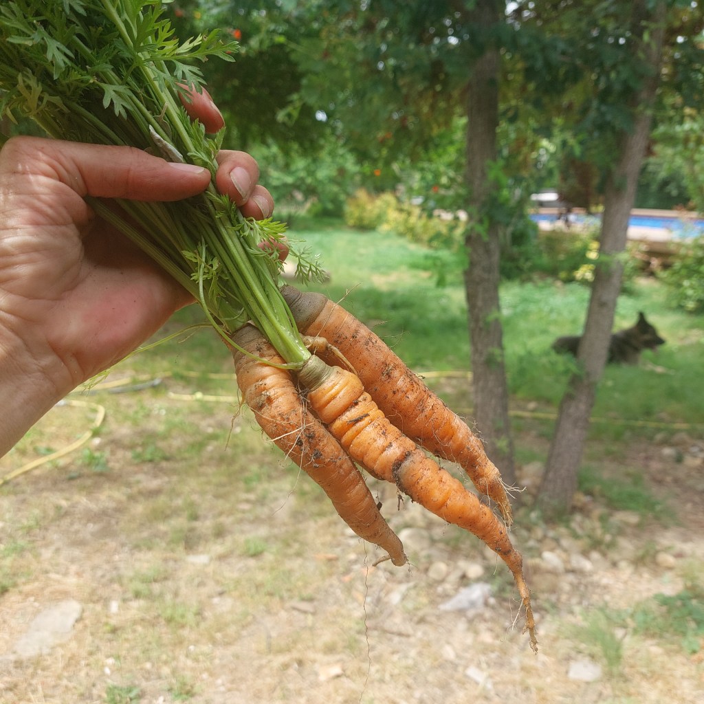 Speaking of gardens, ours is looking very fruitful. All that rain we had over the last couple of months has done it the world of good. The plum trees are sagging under the weight of yumminess and the ‘grenade‘ (pomegranates) is covered in bloom – a good omen. Then there’s the apricots, apples and figs, I have no idea what to do with all of it since its mostly just Mumo and I here, I’d set up a stall outside the front gate except the woofers’ over-excitement at the prospect of visitors would keep sales at bay. The potager is packed with veggies and salad and my carrots are ready for digging up. I am ridiculously proud of my carrots, it’s the first time I’ve grown them and they actually look like what they are supposed to look like. And as for “Domaine Stewart”, otherwise known as my grapevine, that’s groaning with tiny grapes. Apparently I need about 800 or so to make a bottle of wine – I haven’t counted mine but I doubt there’s enough to fill one of those mini bottles in a hotel fridge.