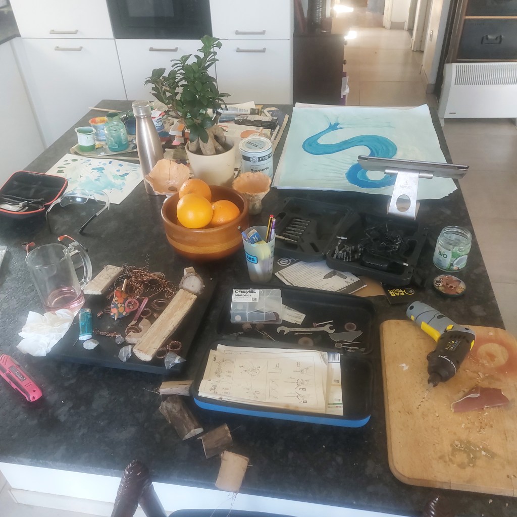Mind you, if one was to believe what is written in the stars, or planets in this case, the appearance of this week’s impressive Blood Moon was all about releasing the past and all that karmic cleansing stuff so who knows but now that I can put all that aside, I’m back on full creative mode even if Monsieur le météo has decided Spring should wait a little longer so the workshop is still my kitchen island. The once-spider haven bamboo is now halfway to being wind chimes and I’ve turned out some rather quirky pendants from various wind-blown branches in the garden. All very busy bee which is just as well as I’m all by my lonesome on this here property for the next few days which doesn’t really bother me as I’m quite enjoying my own company at the moment and Denis does pop in for an apero every evening. And, I have the woofers plus one at present as Louis needs me to look after Sappy until he comes back next weekend which, considering his dog and I don’t see eye to eye, makes me a very nice aunt.
