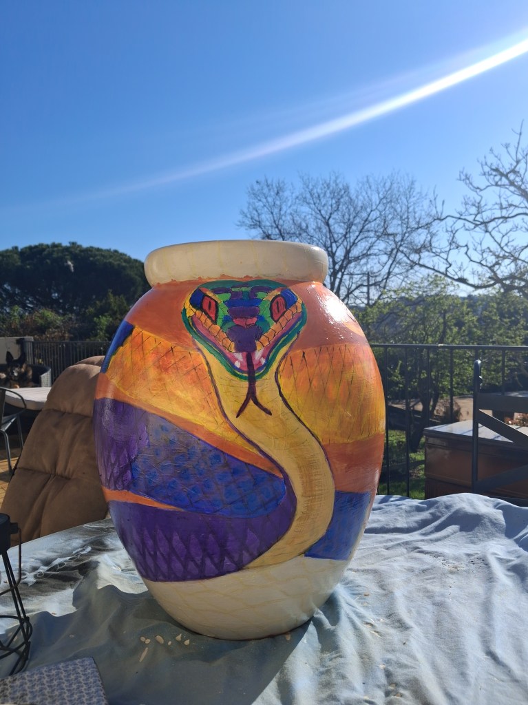 I suppose I should thank the arrival of Spring in terms of its Equinox for lifting the spirit too and making one just want to get on with things. The afore-mentioned Alice got a good going over with the clippers and her son Sherman a couple of hours with yours truly stripping his winter coat out. He’s always gorgeous but more so now and not just because he no longer resembles a bog brush but also behaved impeccably when I took him over for a play date with my mate Jude’s little Cavalier puppy – he didn’t once cock his leg on her pristine cream sofa suite or dig a hole under fence. The woofers do like to surprise me. Oh, and I finally finished the snake pot. I have to be honest, I wasn’t overly thrilled with the result at first but as I have had a fair few wows and requests for more custom designed terrace terracotta, its grown on me, or coiled itself. Mind you, I’ve still got a load of ex-chandelier pieces to finish wrapping and a gratefully donated lilac branch to whittle into something whimsical so plenty to keep the mind mellow. Might also have some news next week too, fingers crossed…